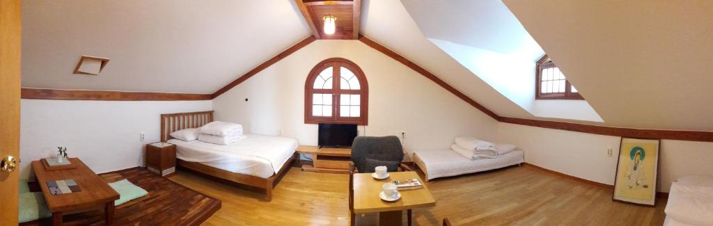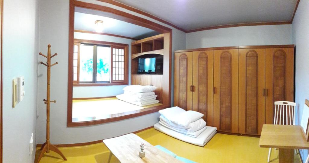 "저희 배정 받은 방이 3층 다락이라서 조금 좁은감이 있었지만 창문이 있어서 다 열고 하나도 덥지 않게 시원하고~ 공기도 청량해서 잘 잤어요 방에 거울이 없어서 조금 불편했지만 덩치 좋은 네 가족이 아늑하니~ 붙어있어 그래도 재밌고 괜찮았습니다^^ㅎ"